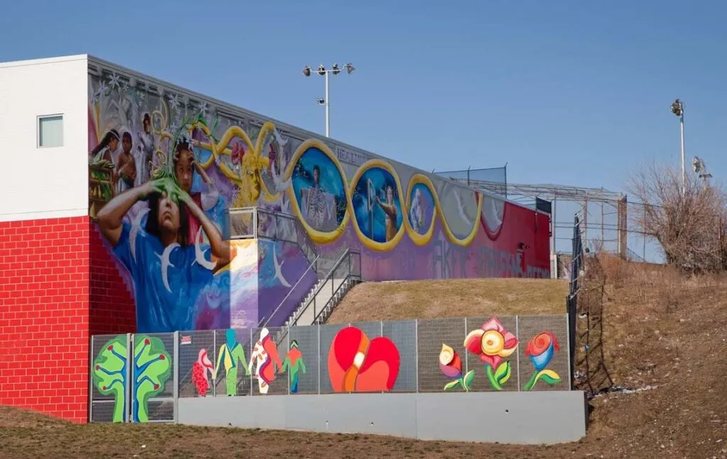 The Angel Coming Down by artist Frito Bastien is located in the Norris Square neighborhood of Philadelphia, Pennsylvania. A hallmark of many of Bastien’s murals is painting in the traditional folk style of his home country of Haiti. He worked with the community to develop the uplifting design of the angel watching over the elders and youth of the community while they are engaged in their gardening and communal activities. The mural offers a gently whimsical treatment of a traditional spiritual theme.