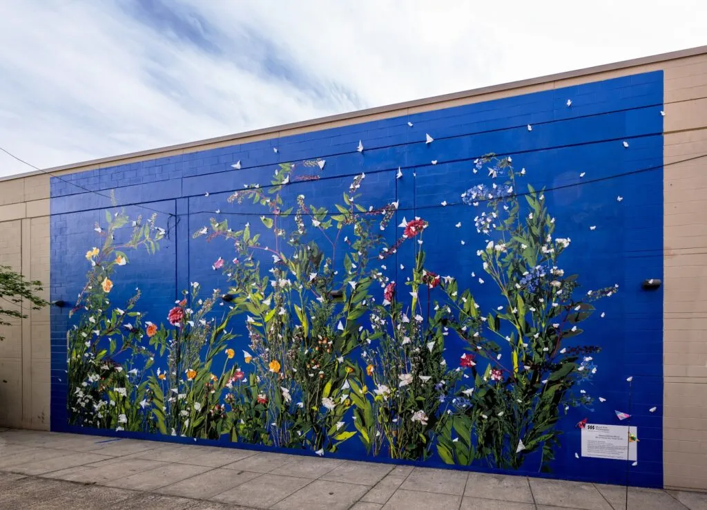 This untitled mural by artist Frito Bastien was located in the North Philadelphia neighborhood of Philadelphia, Pennsylvania. It presents an idyllic landscape of rolling hills and farm fields. A small barn in the foreground leads the eye to a road that transports the viewer into the distance, past tilled earth planted with crops under towering palm trees.