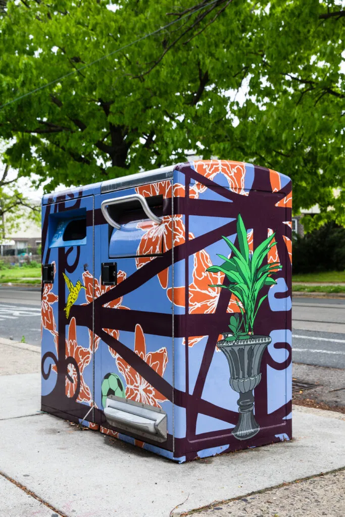 Language Lab is a mural by artist Shira Walinsky located in South Philadelphia. As an artist and educator, Walinsky works with the Porch Light Program to address the mental health and wellness of individuals and communities in Southeast Philadelphia, in partnership with the Department of Behavioral Health and Intellectual disAbility Services. This mural is a comment on the multilingual nature of South Philadelphia. There are over 30 languages spoken at the local Furnace high school. Language Lab celebrates this diversity on a background resembling a geometric weaving. Hopefully, as you wait for the bus, you might learn a new word in Lao, Thai, Khmer, Spanish, Arabic, Mandarin, or Karen.