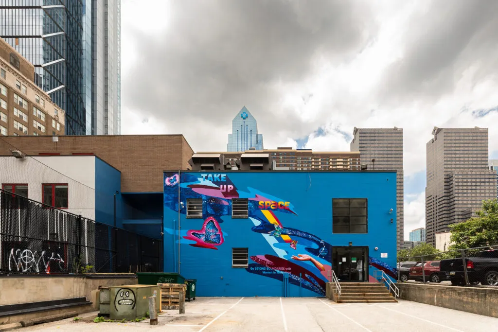 The mural by Shira Walinsky combines Victorian and North African patterns to place the viewer in context with the neighborhood. Portraits of silhouetted girls reference the idea of female empowerment.