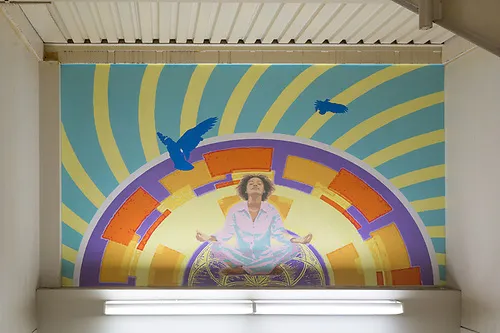 A middle-aged woman rising from the blue flames that surround the central medallion. She represents the central girl as a grown-up as well as her ancestors who survived the holocaust which claimed millions and to this day impacts the way each of us lives our lives.