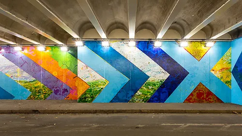 The plates were arranged in the landscape as if they were flowers. All the students collaborated on the placement of the plates so the mural would flow from one end of the wall to the other.