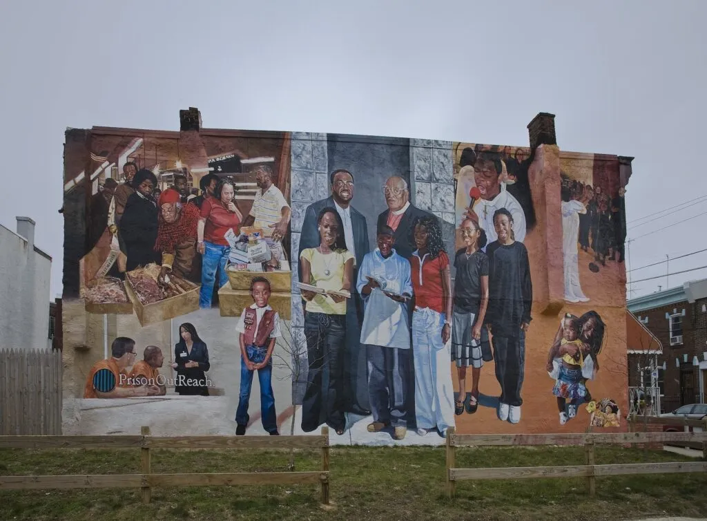 Tribute to the Italian-Americans of Tacony by artist Karl Yoder is located in the Tacony neighborhood of Philadelphia, Pennsylvania. A tribute to the many Italians who immigrated to the US in the early part of the 20th Century and particularly in the Tacony section of Northeast Philadelphia, this mural features the faces of men, women, and children who make up a portion of this community. Standing in front of a church and a municipal building under an Italian and US flag, this mural emphasizes that the Italian American community has a presence in the wellbeing of the community at personal, political, and spiritual levels.