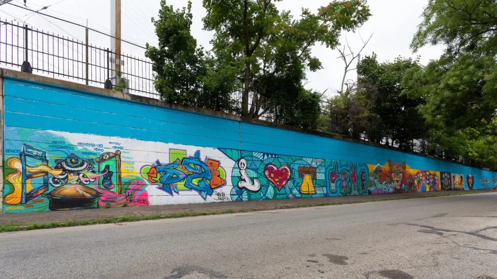 The original mural depicted a landscape of a river scene. The ca. 400 foot-long-mural began at the north side of the retaining wall, near the underpass, depicting distant trees with a walking path and gazebo situated among a green space along a vast expanse of river, showing people engaged in various activities (walking, bike riding, fishing, relaxing). The scene then expanded along a vast expanse of water dotted by sailboats under a blue sky dotted with clouds. To the south side of the wall, the clouds and water started to blend, eventually dissolving into an abstract patterning of white, green and blue shapes.