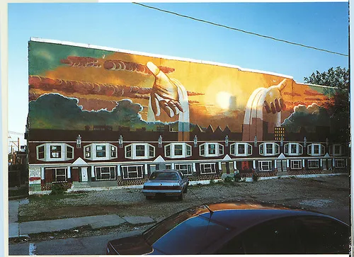 Compassion by artists Ras Malik and Ben Israel is located in the Kingsessing neighborhood of Philadelphia, Pennsylvania. A neighborhood of row houses sits below spiritual hands draped in cloth echoing biblical scenes of forgiveness and togetherness. This mural celebrates the spiritual roots and rebirth of this community.