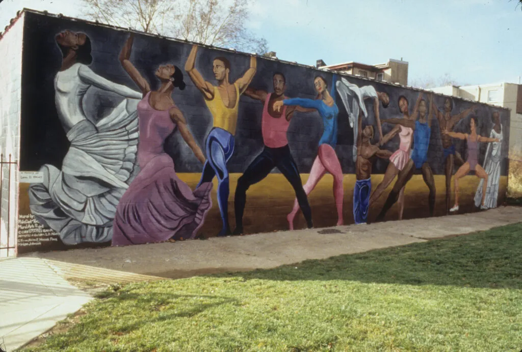 A Celebration of Community by artist Jane Degenhardt-Kutzer was originally conceived as a tribute to the ethnic cuisines found in West Philadelphia. The community expressed an interest in creating a mural around the theme of the family. An older couple who had lived on the block for a long time posed for the photograph. They tended their garden with the same reverence that they cared for each other. The mural is dedicated to the man who lived in the house whose wall the mural is painted is on. He died while the mural was being painted. The artist, originally from San Francisco, was selected for her graphic, colorful style that she developed as an illustrator for children’s books.