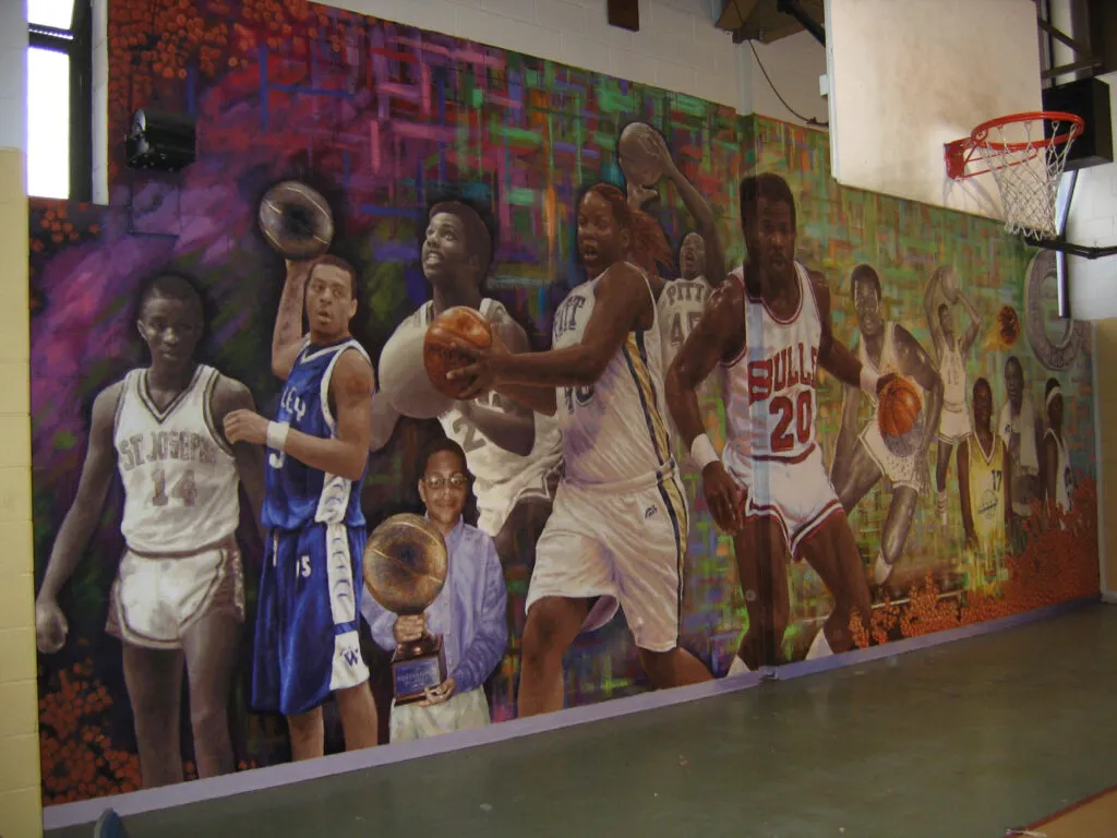 Remebering for Today’s Inspiration by artist Efrain Herrera, is located inside the A. W. Christy Recreation Center in West Philadelphia. Positioned next to the basketball court, the mural features prominent basketball players from the area through history, like Gene Banks who played in the NBA with the San Antonio Spurs, and Chicago Bulls.